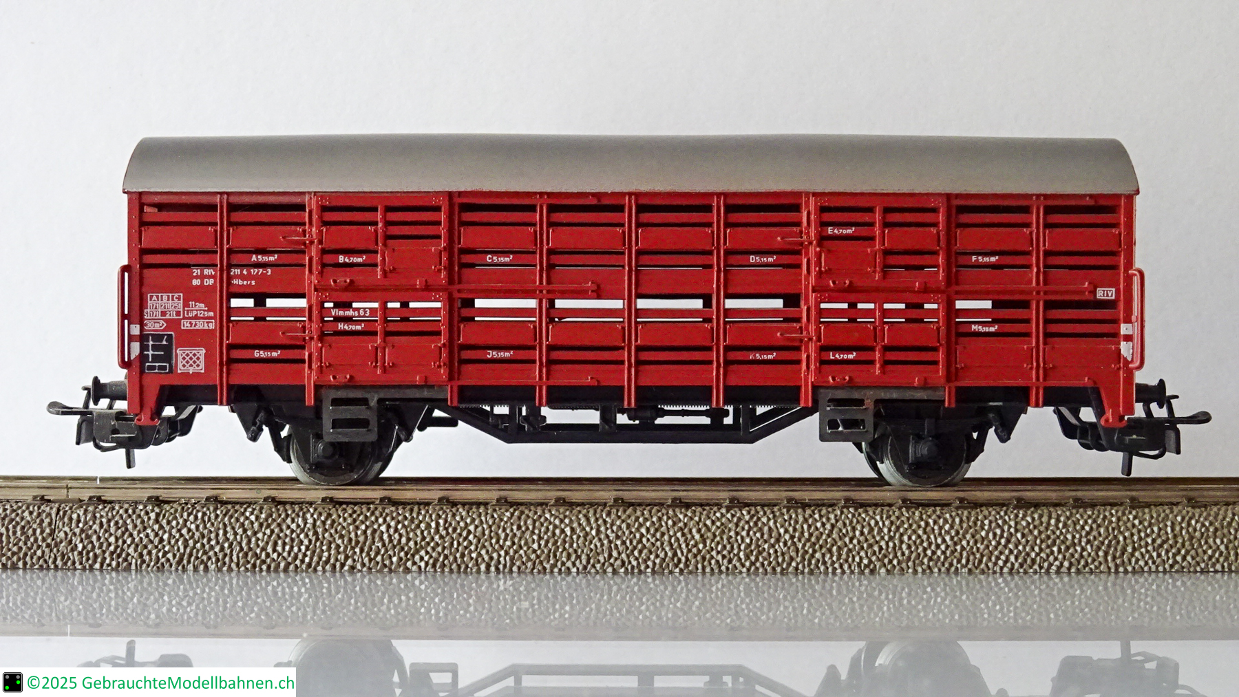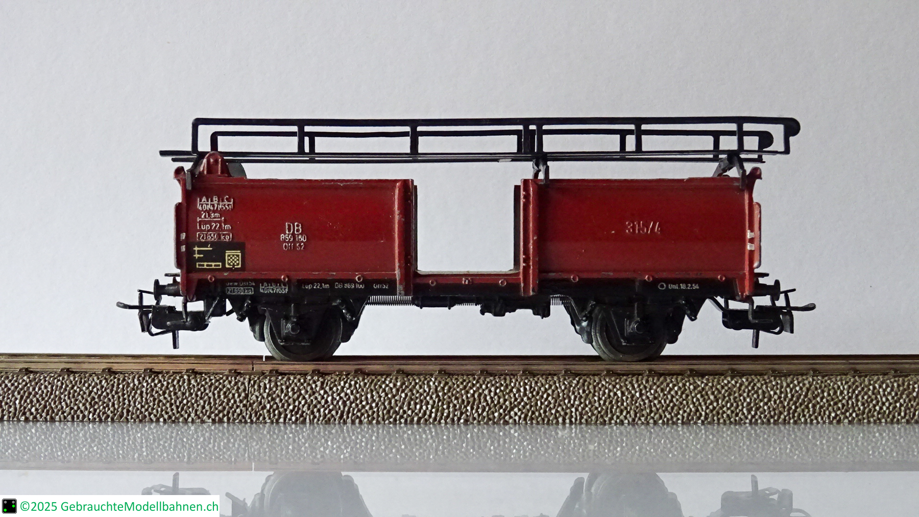 Bezeichnung: | 2-achsiger offener Güterwagen, aussen und innen rotbraun, ohne Chassisrandaufschriften, Bügelkupplungen |